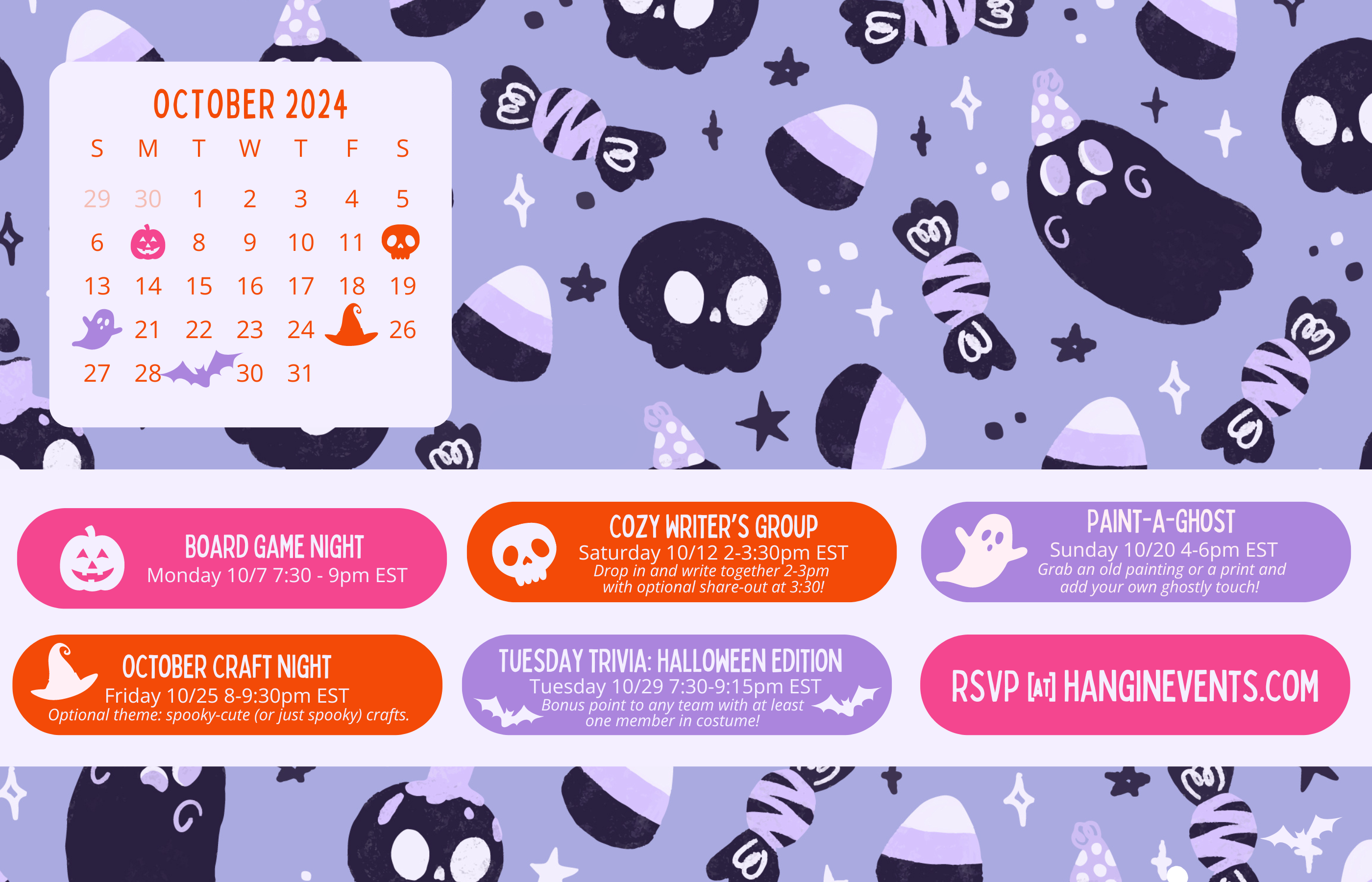 I am so excited for October! Cozy fall crafts, Halloween-themed events, apple cider donuts… the list goes on ◡̈ I made some silly October desktop calendars that I hope you’ll enjoy – three different styles, all with the five events I’ve got planned plotted onto them. Happy spooky season to us all!